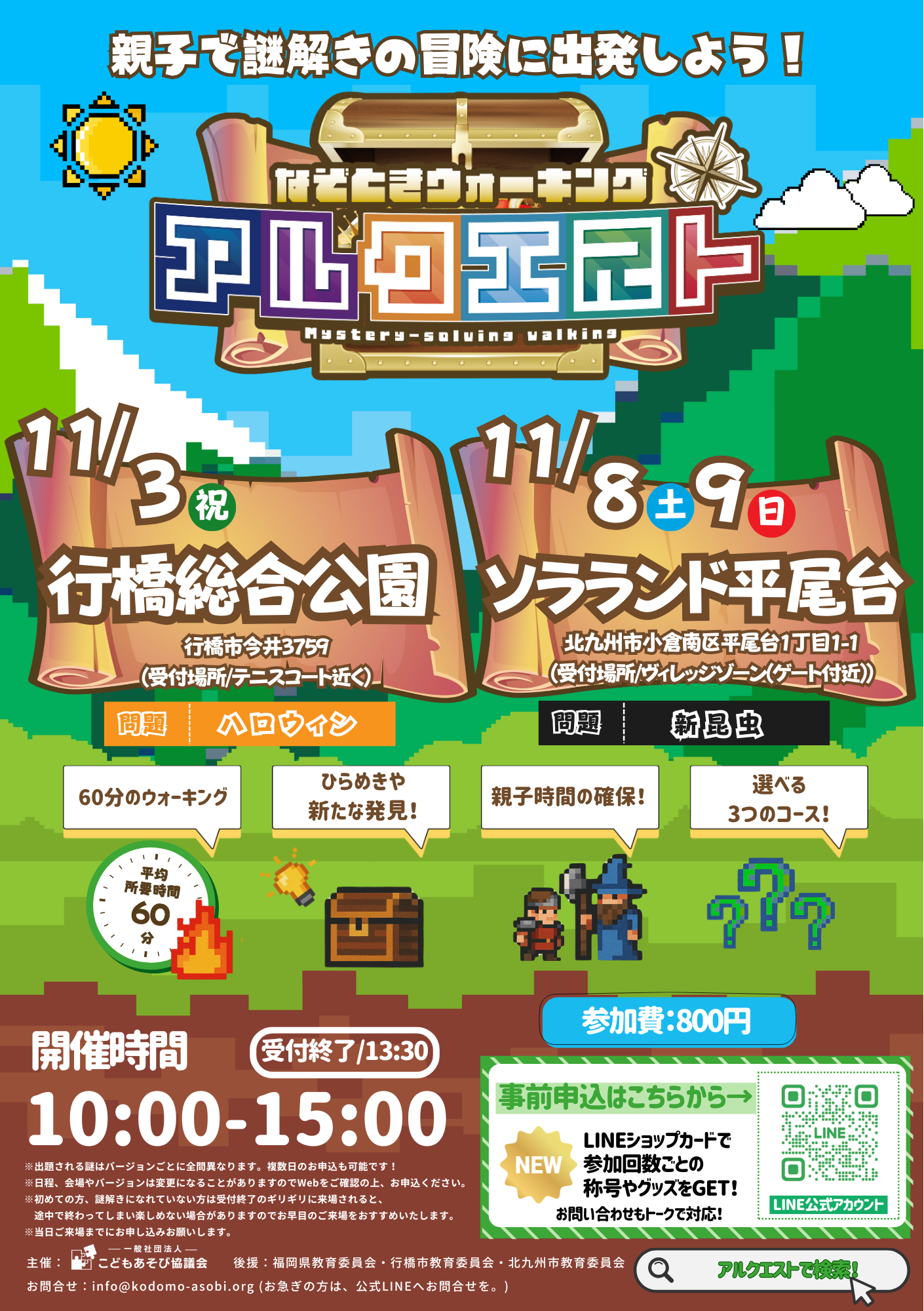 イベント 2025.10.18 2025.11.8~9謎解きウォーキング-アルクエスト- 日程:2025年 11月8日~9日 時間:10:00〜15:00(13:30受付終了) 会場に散らばった10問のなぞなぞを探して、謎解きにチャレンジ。親子で歩いて、謎解きしてと頭と身体を使って楽しめるプログラム。 アルクエスト | 親子で楽しむ小学生向け謎解きウォーキング | 全国で開催中 (alquest.org) イベント