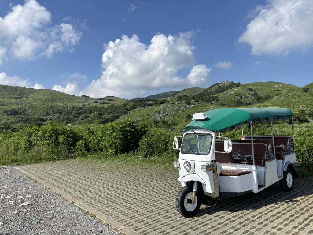 GW特別コースになっています。一周約10分で平尾台の不思議などをガイドしながら走る爽快トゥクトゥクツアーになっています。小さなお子様連れでもその場でご予約可能です。